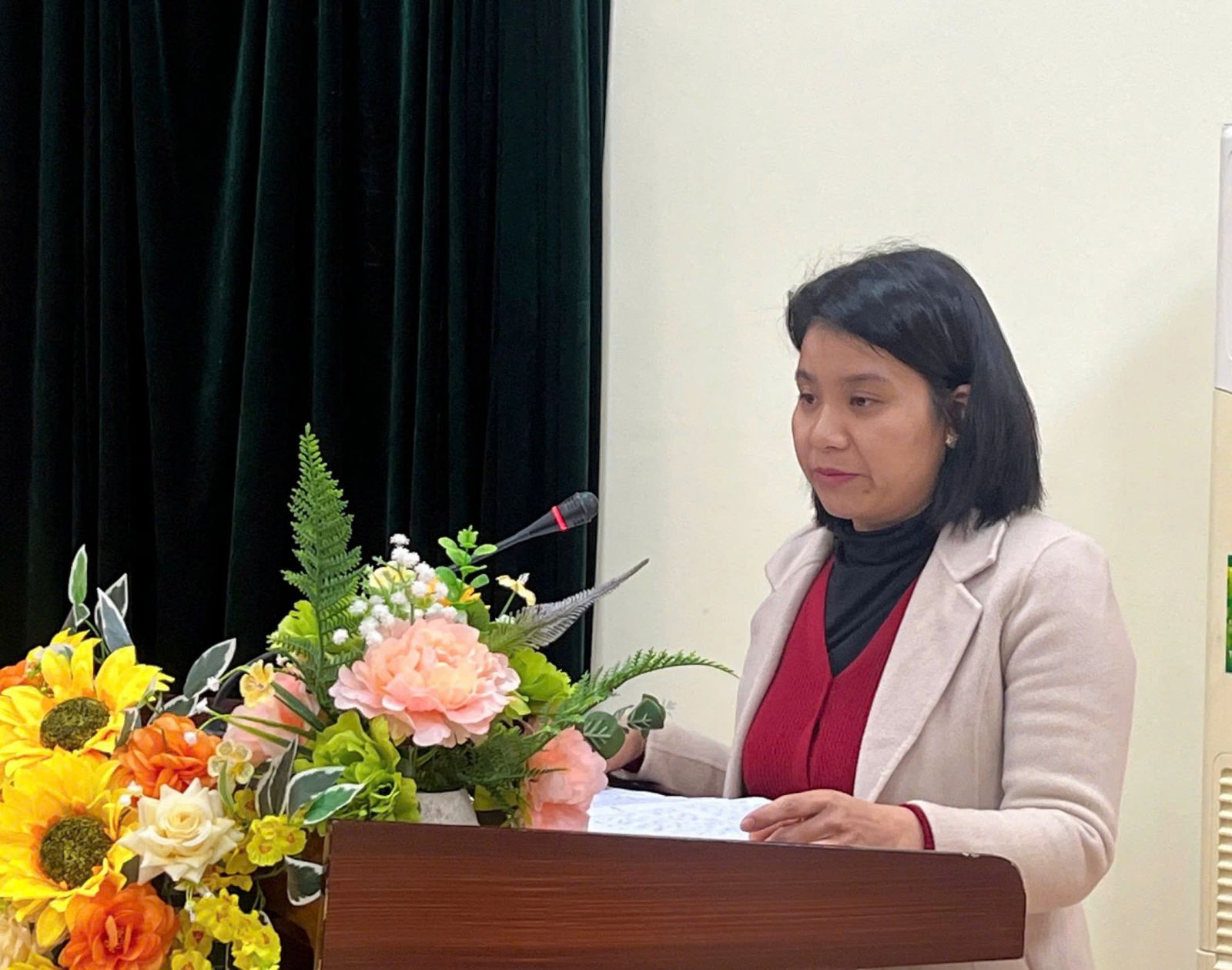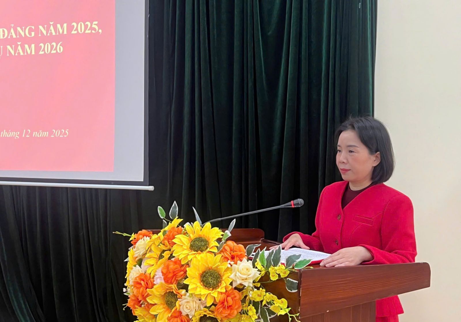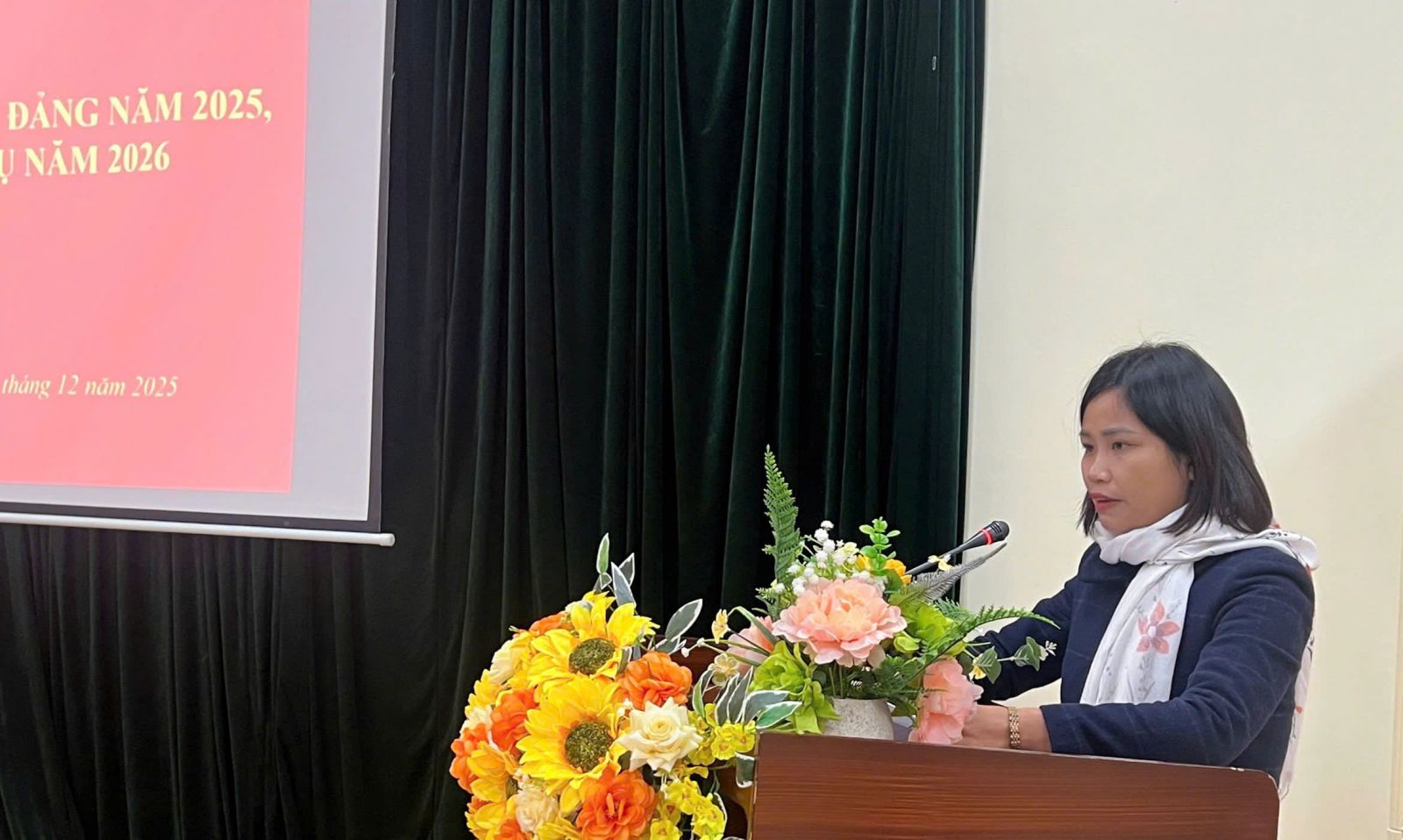 Đc Phan Thị Tắn - Phó BT Đảng ủy, Phó Giám đốc TTYT báo cáo kết quả thực hiện công tác Đảng năm 2025, nhiệm vụ năm 2026