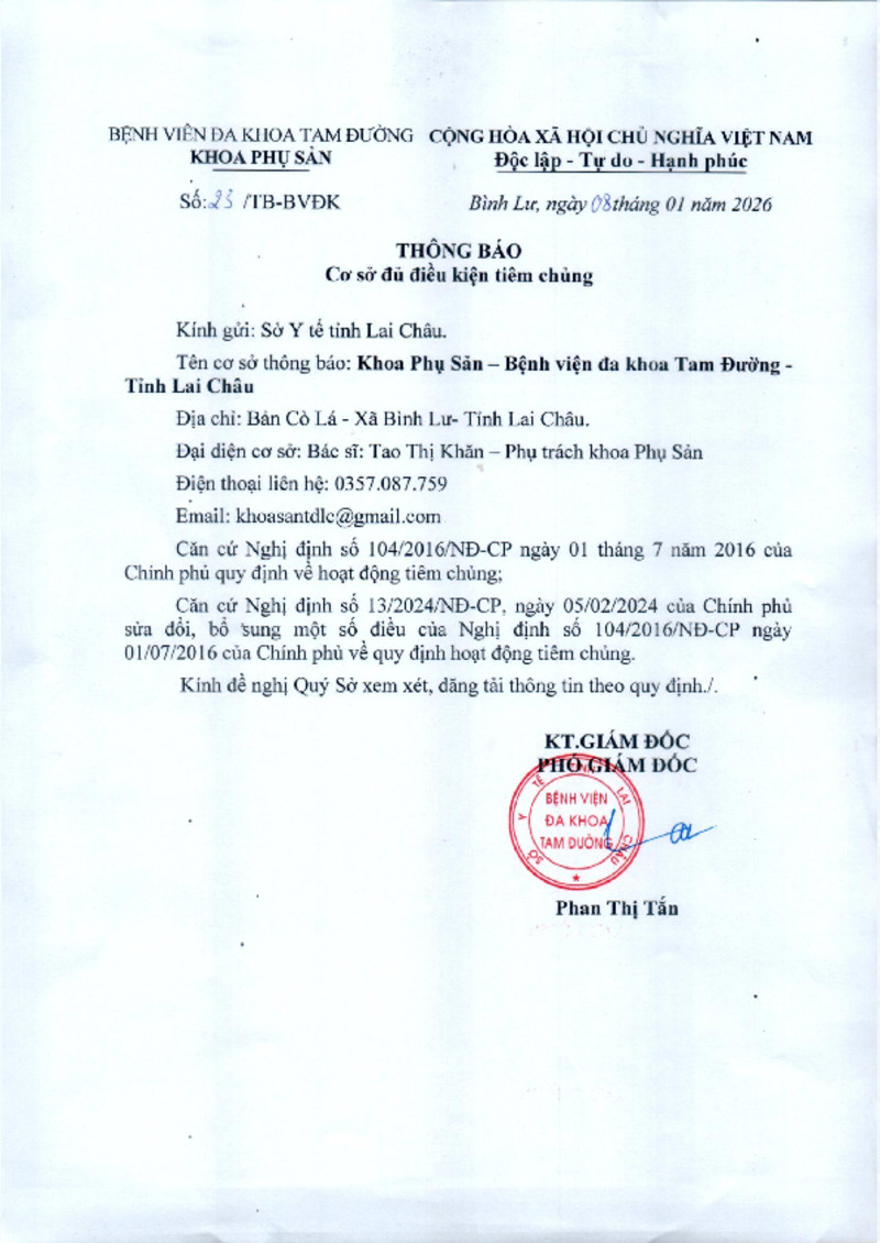 | Số hiệu | 23/TB-BVĐK | Cơ quan ban hành | Bệnh viện đa khoa Tam Đường |