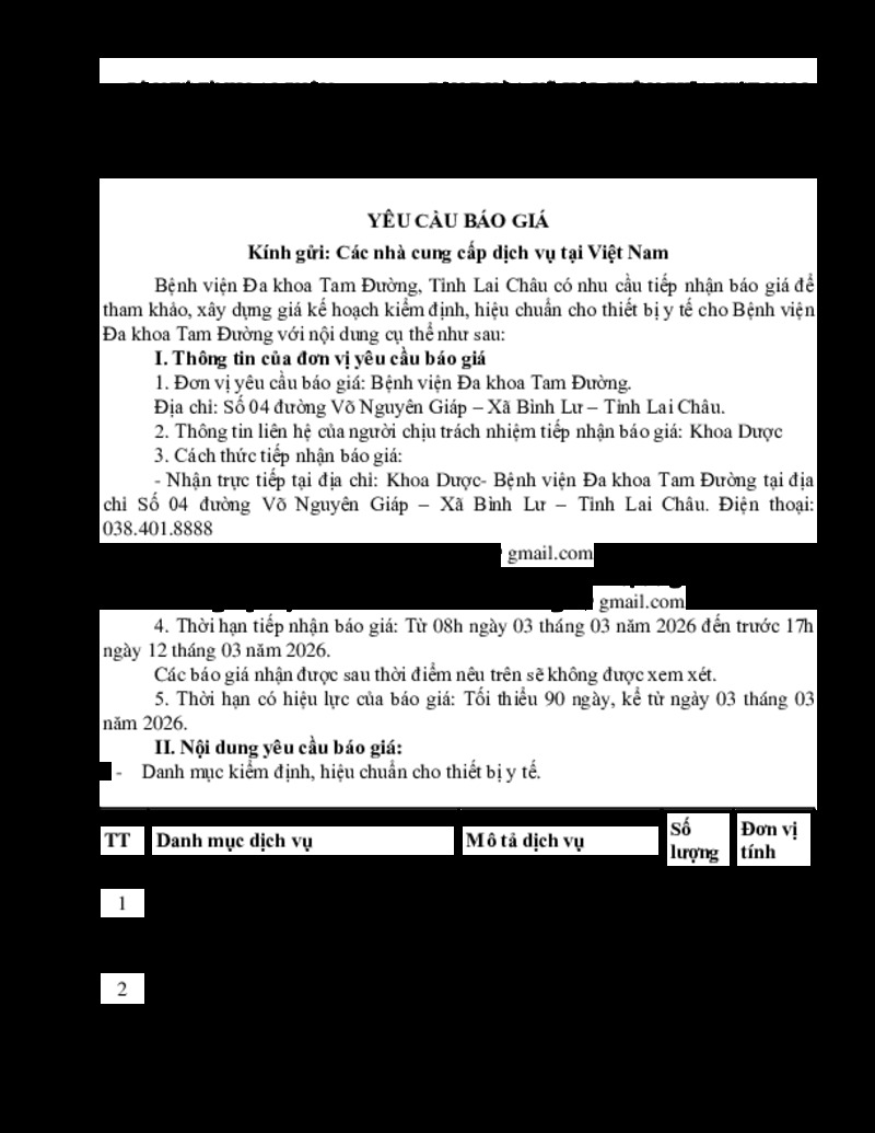 | Tiêu đề văn bản | Yêu cầu báo giá kiểm định, hiệu chuẩn cho thiết bị y tế cho Bệnh viện Đa khoa Tam Đường | ||